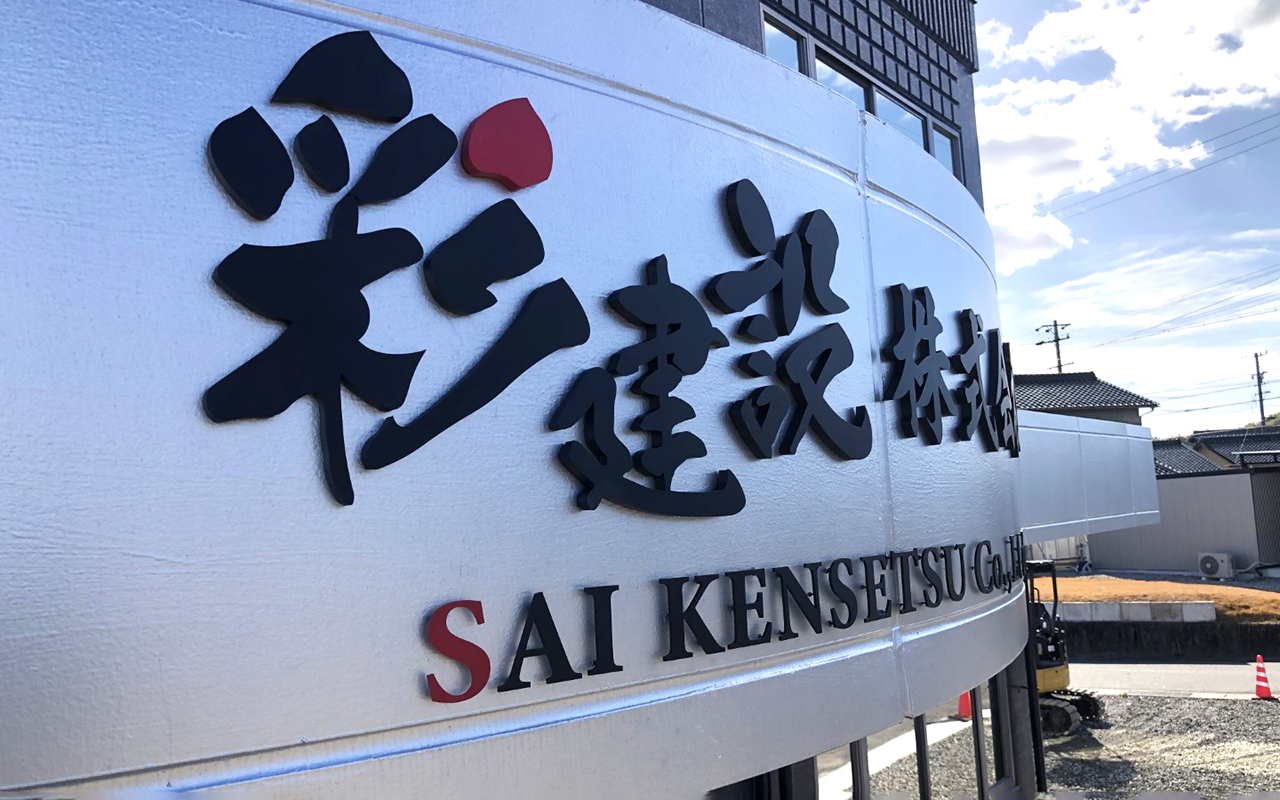 箱文字のサイズは「彩建設」がH(文字高)340mm、「株式会社」がH200mm、D(厚さ)はどちらも10mmとなっております。アンカーボルトは50mm(ボルト径4mm)