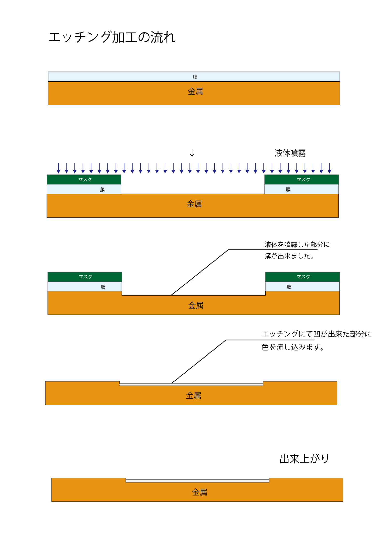 金属表面に腐食性のある液体を使用し、目的の箇所に溝を作る方法となります。