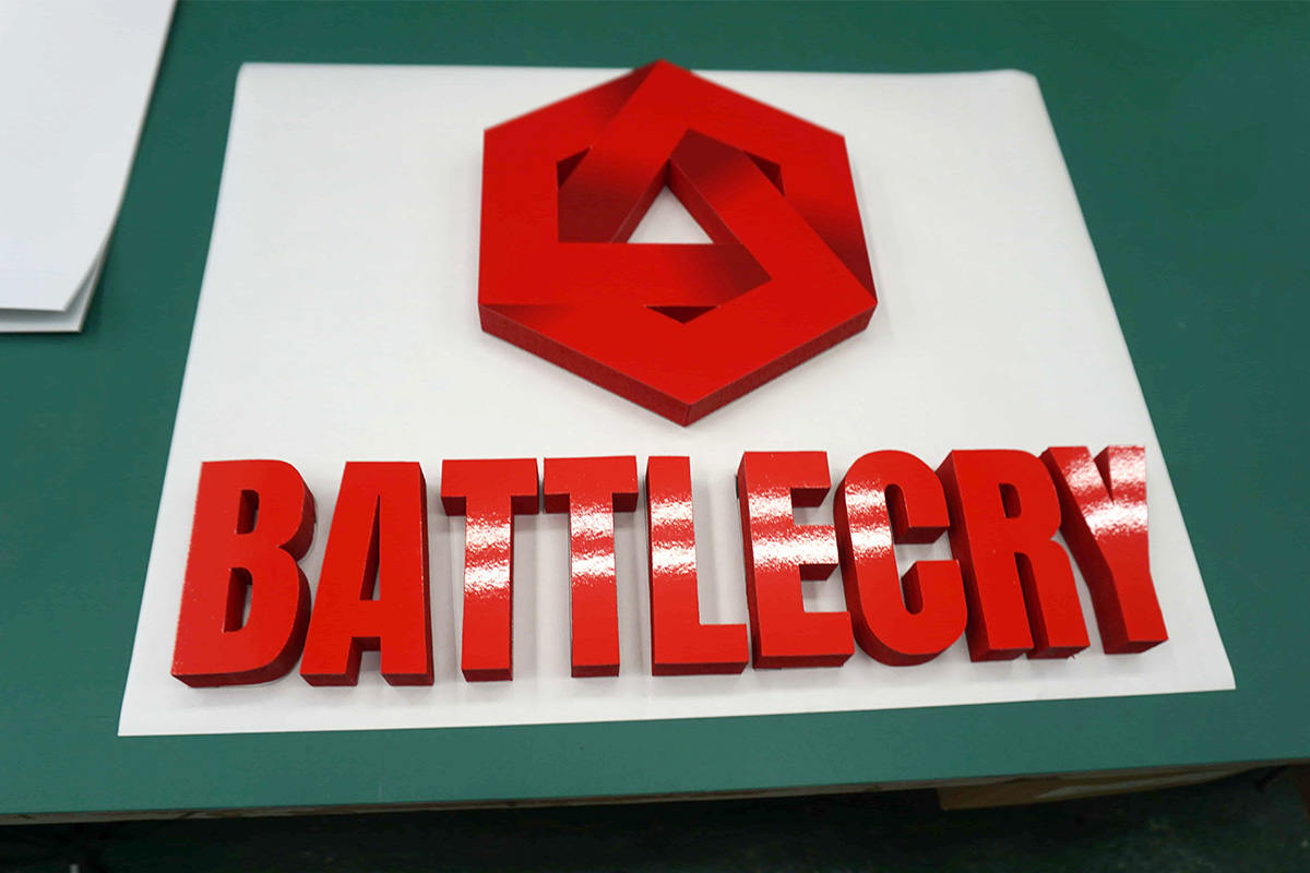 実際はロゴ、文字ともに平坦なのですが、ロゴにはインクジェット出力シート、文字にはマーキングフィルムが貼られています(ラミネートは艶あり)。影のように見えるグラデーションも印刷によって表現しております。