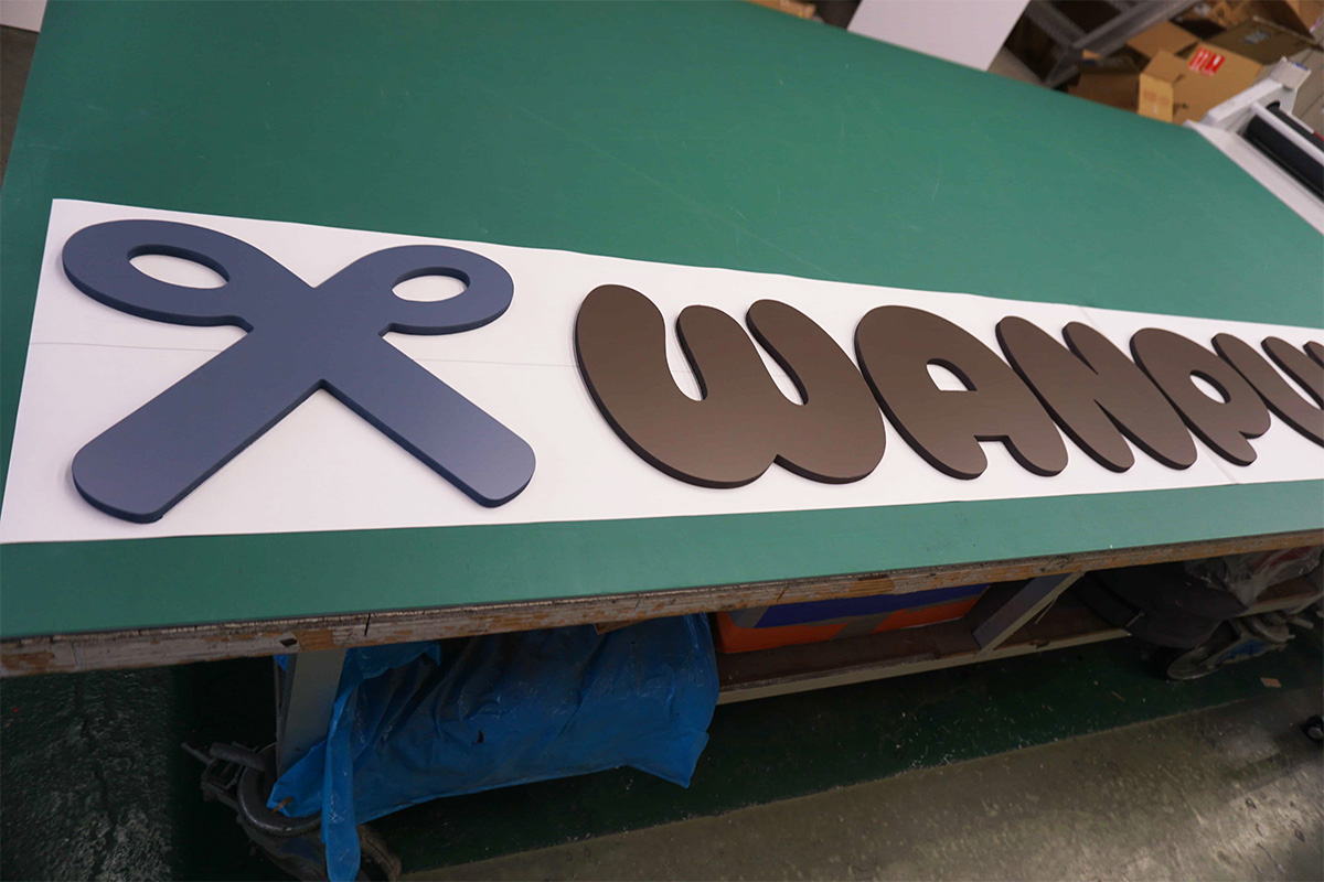今回製作させていただいたカルプ文字は全体で、H300×W2544mm、厚さは10mmです。正面はインクジェットシート貼り仕上げ、小口(側面)は近似色で塗装、ラミネートはマット(艶消し)となっております。